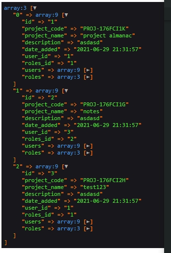 });Take note when retrieving the relational table datas use the relation-table that you specify in the with method followed by the column name you want to retrieve from the relation-table like this : $project['users']['fullname']